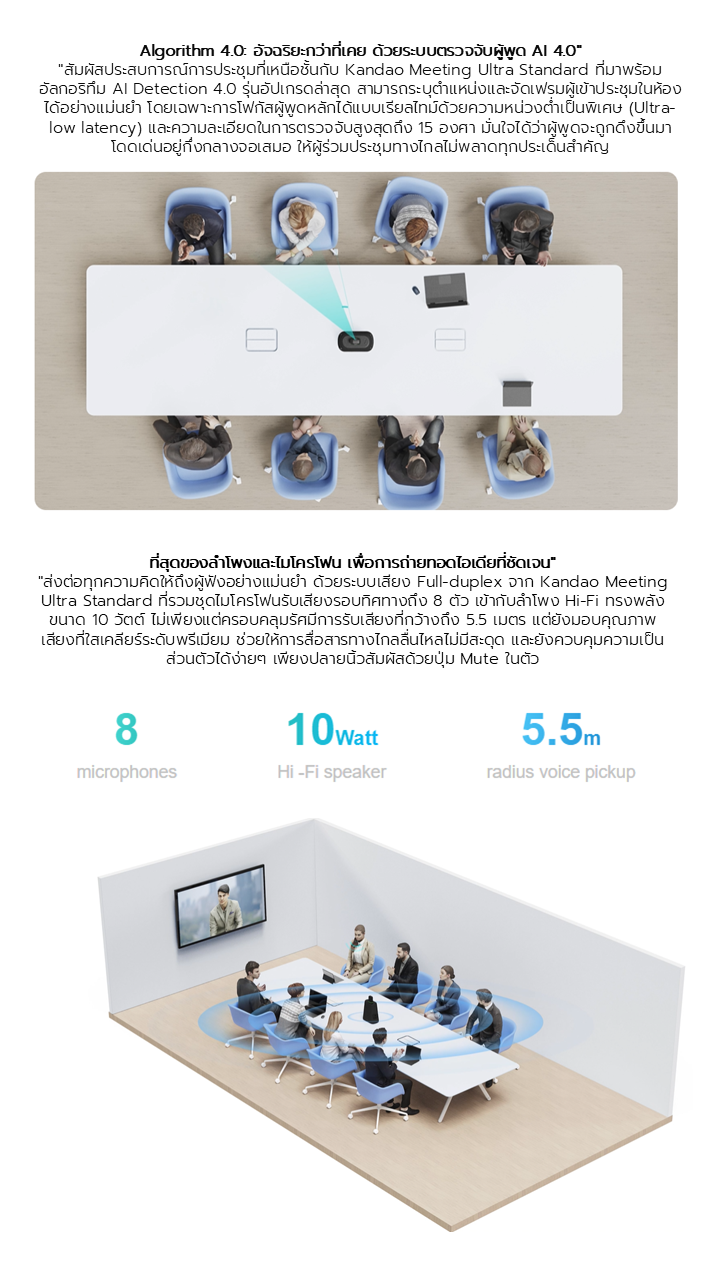 360o Camera.8 microphones, which can cover range to 5.5 meters radius.10W Hi Fi Speaker